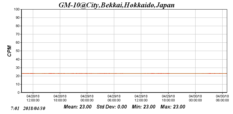 グラフの数値は、毎分のCPM値で、CPM値に0.00833をかけるとμSvになります。